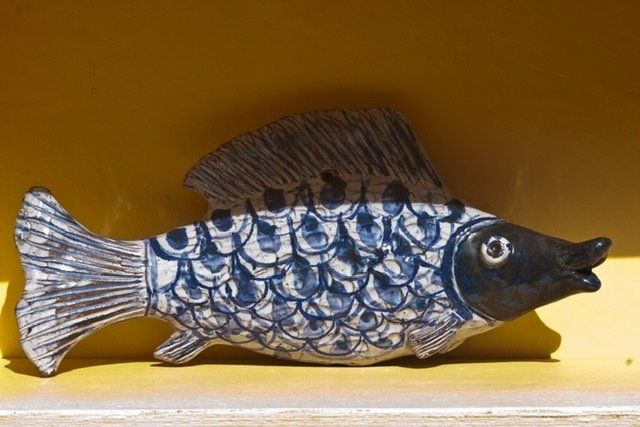 Die kleinen Tonfiguren dienten als Vorlage für die grossen Papiermaché Figuren. Grossformatige Tonfiguren wollten mir anfangs nicht gelingen, da ich die entsprechende Technik, mit Einschätzung des Trocknungsgrades und der Stabilität im Aufbauprozess noch nicht beherrschte. Gemeinsam mit Stefan modelierten wir, jeder nach seiner Art eine Vielzahl von unterschiedlichen Fischen. Sie alle wurden mit Glasuren, Engoben und Oxiden bemalt und im Gasofen bei 1100 Grad gebrannt.